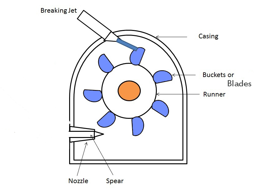 As the fluid strikes the blades or buckets, it rotates the runner. Here the energy of the moving fluid is converted into rotational energy.